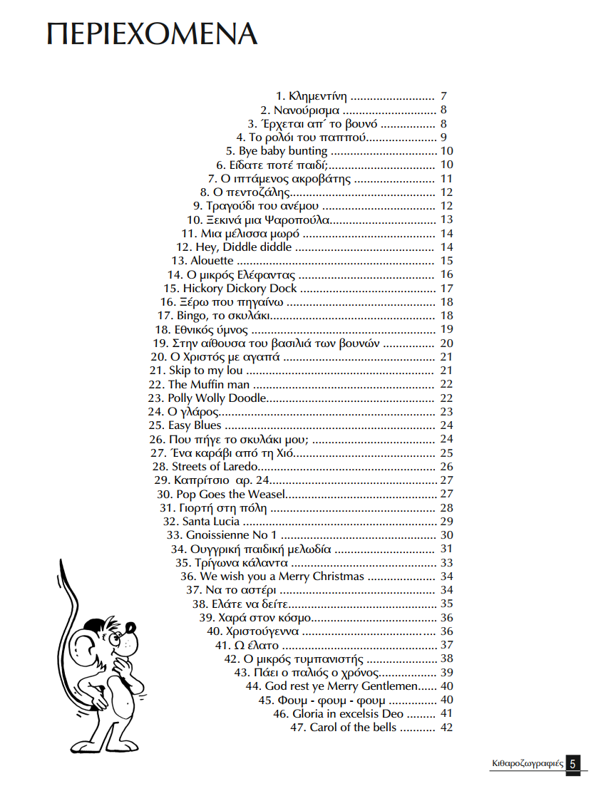 Οι μελωδίες χωρίζονται σε μικρότερες μουσικές φράσεις, ώστε να μαθαίνονται εύκολα και να μην “τρομάζουν” τους μικρούς κιθαριστές!